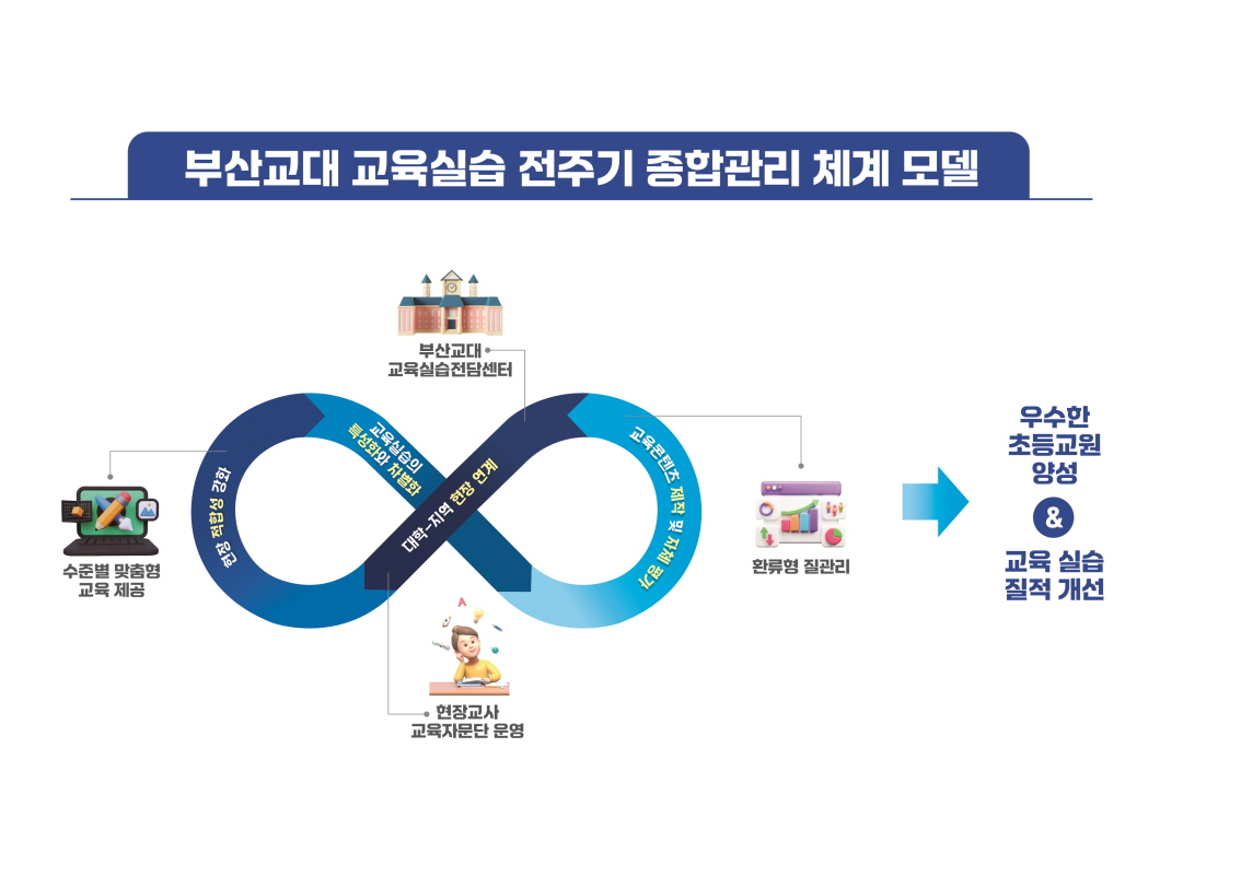 본 센터는 교육실습 교육과정의 체계적인 운영을 위하여 부산교대만의 특성화 모델인 ‘교육실습 전주기 종합관리 체계’ 를 구축하여 운영하고 있습니다.
